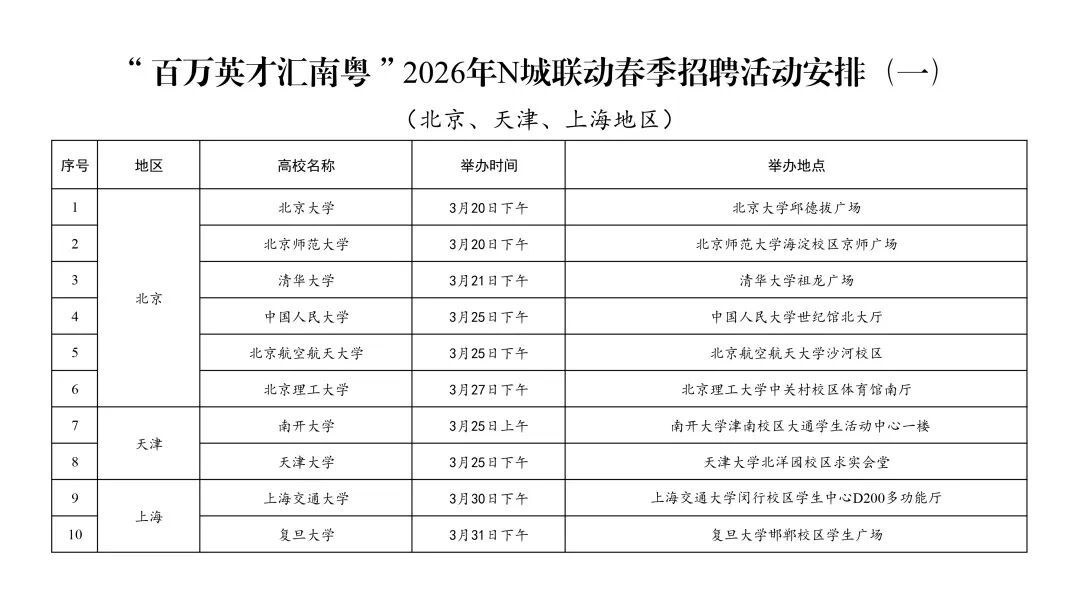 首场全省示范招聘活动将于3月20日在北京大学开启;至3月底前,在北京、天津、上海三地将率先密集举办10场示范招聘活动,持续奏响“东西南北中,发展到广东”的强音。