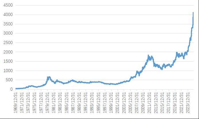 数据来源:Wind,图中展示伦敦现货黄金价格,单位为美元/盎司,按月统计,统计区间为1969/12/31-2025/10/23。