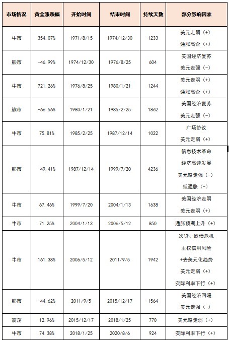 驱动黄金价格的因素比较复杂,其价格波动也难有一般规律可循,一次起落周期有时很长、有时很短。例如下面所列不同时期对黄金走势的部分影响因素,黄金市场每一轮牛熊变换背后的原因都各不相同。